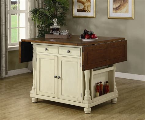 These cabinets and center island are matched well by the lighter backsplash and hood vent. Kitchen Carts Two-Tone Kitchen Island with Drop Leaves. Two-tone kitchen cabinets work best if other colors in the room are highlighted.